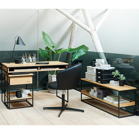 With a square, airy black metal frame as a contrast to NATURAL oak veneers, which are enhanced by a light brushing and built-in handles, this...