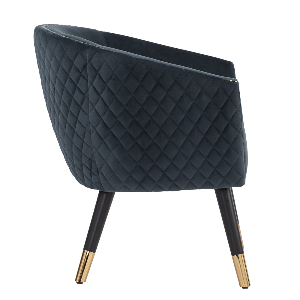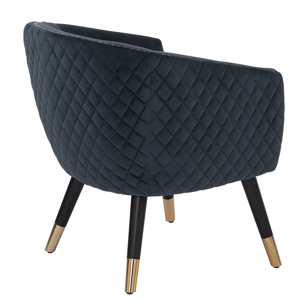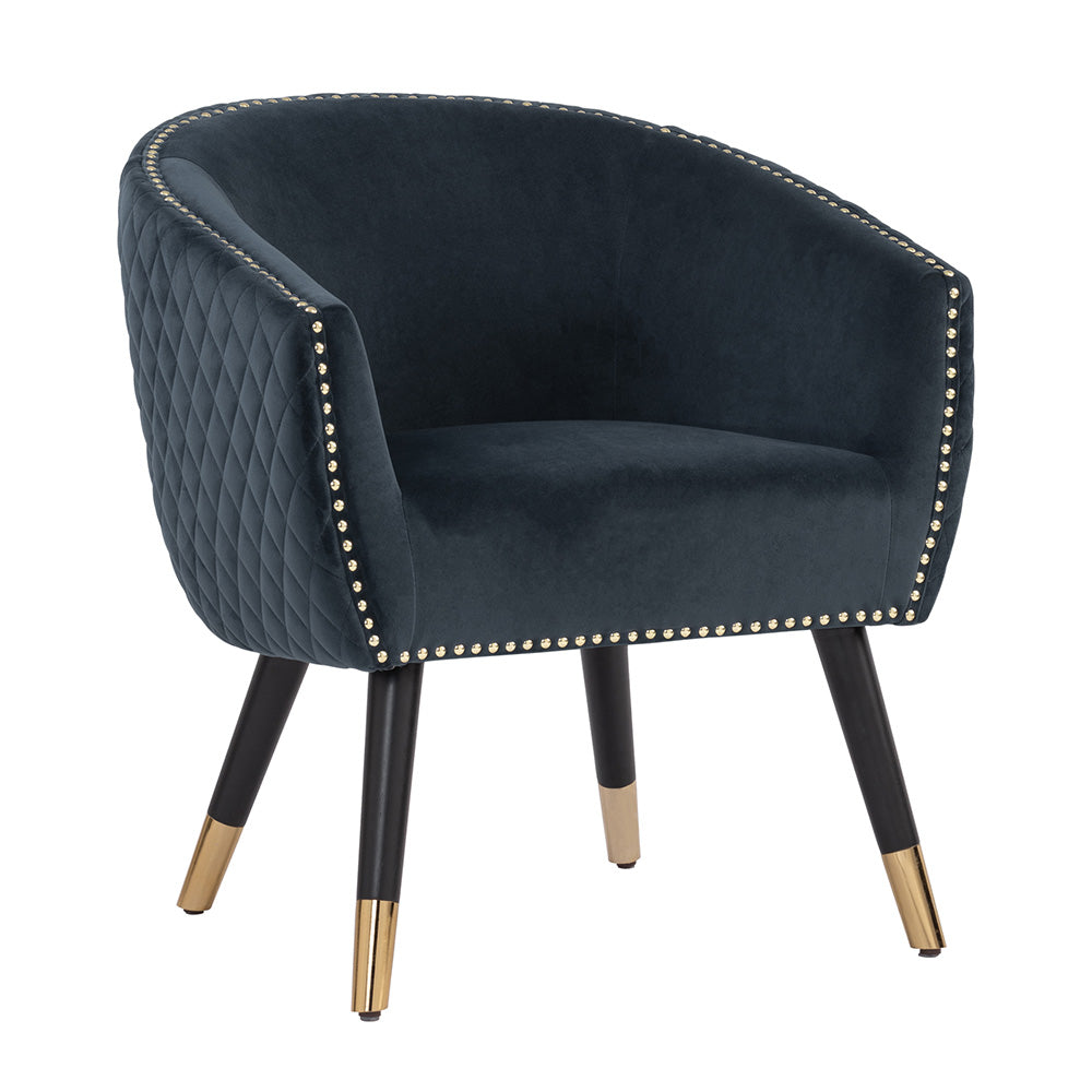 The DENIZ Lounge Chair in Denim Blue features a gracefully designed curved backrest and soft-to-touch fabric upholstery, exuding exquisite craftsmanship and offering optimum comfort. The slanted backrest and quilted pattern accentuate the contemporary feel, while the gold-plated base adds a glamorous touch.