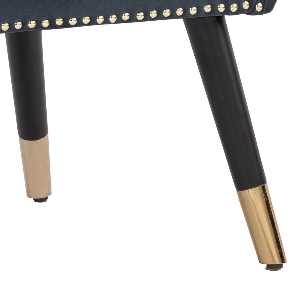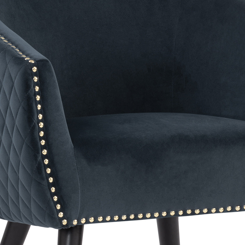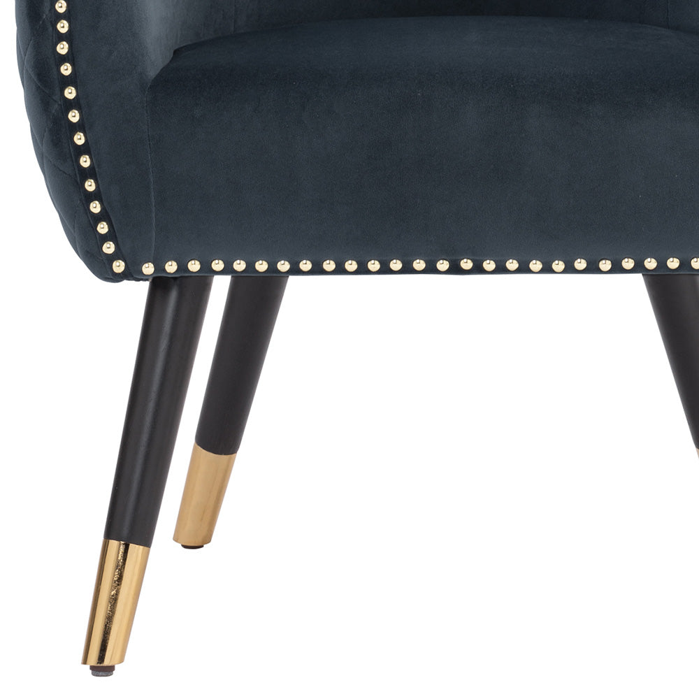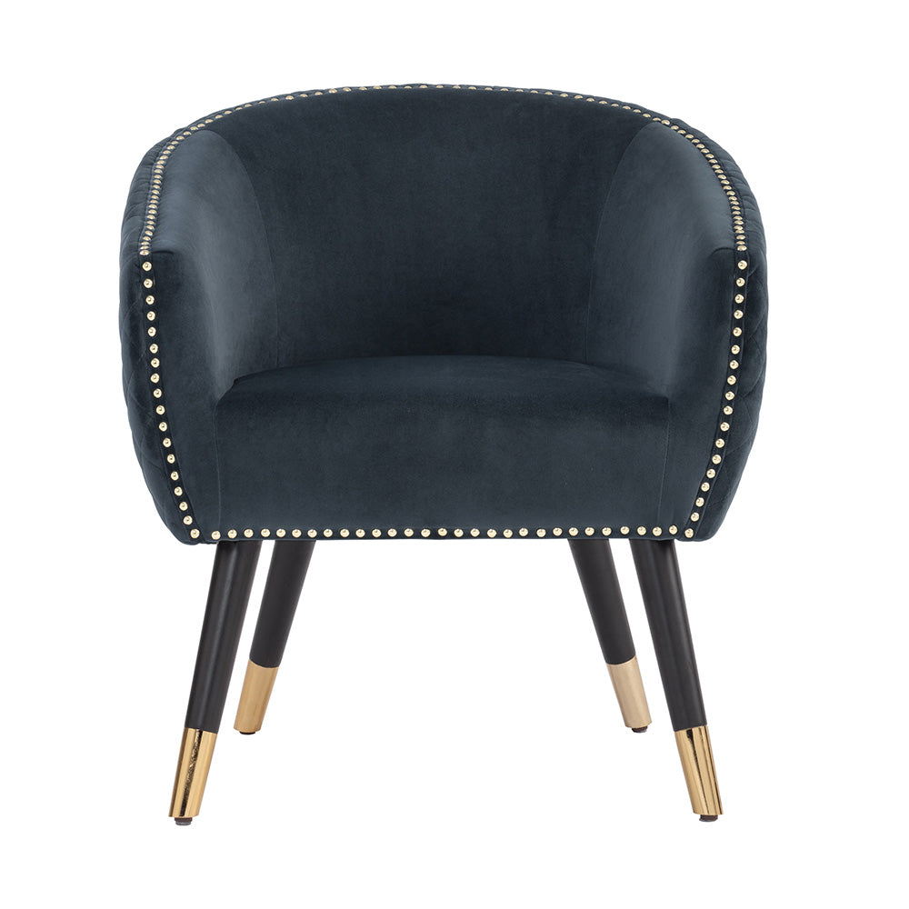 The DENIZ Lounge Chair in Denim Blue features a gracefully designed curved backrest and soft-to-touch fabric upholstery, exuding exquisite craftsmanship and offering optimum comfort. The slanted backrest and quilted pattern accentuate the contemporary feel, while the gold-plated base adds a glamorous touch.