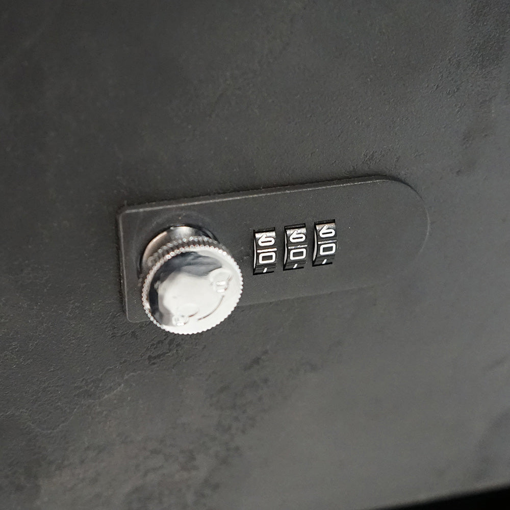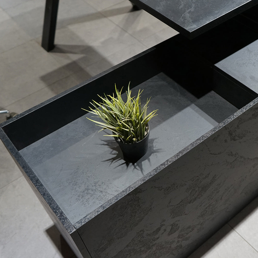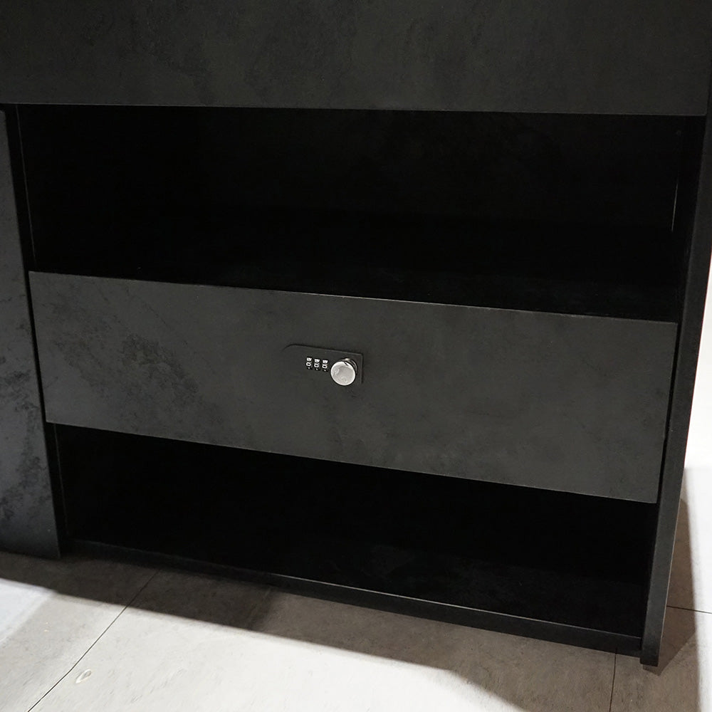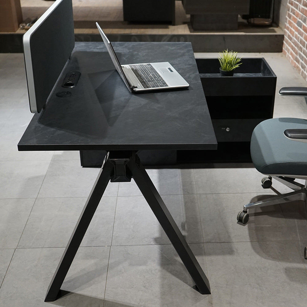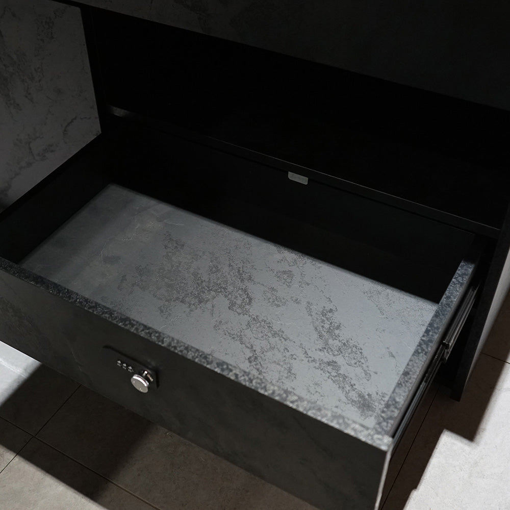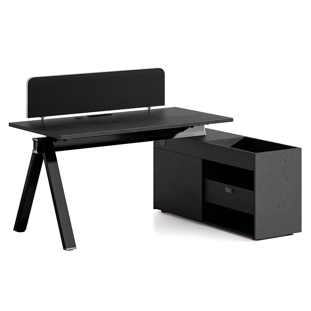 Crafted with an exclusive matte-black concrete finish, the German Hueck textured commercial-grade melamine offers a refined and modern look. Complemented by powder-coated matte black metal legs, this workstation provides exceptional durability and a sleek, cutting-edge aesthetic.