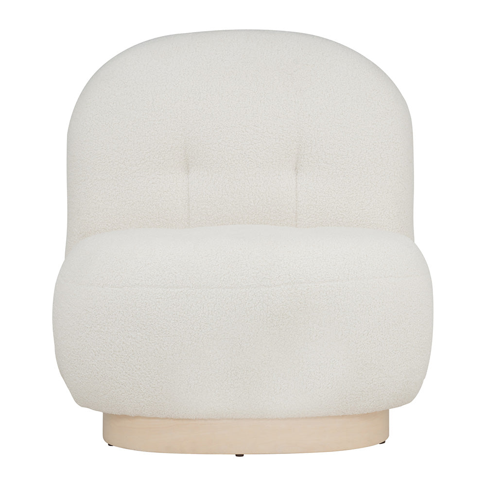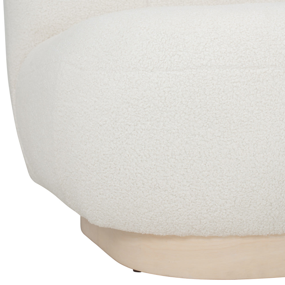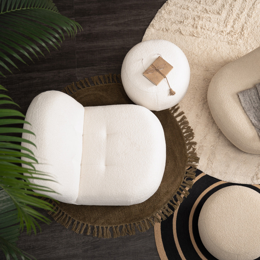 Ergonomically designed with a slight recliner backrest and a wide seat for added comfort. With it's chic round silhouette, this chair exudes contemporary charm, making it the perfect addition to any stylish living space. The luxurious boucle fabric adds a touch of elegance while providing a soft and cozy seating experience.