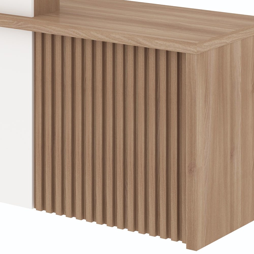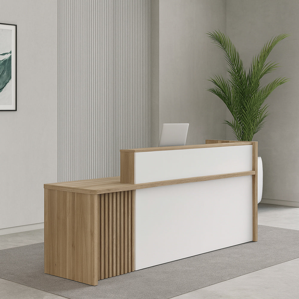 The KNOX Reception Desk 180cm with Left Counter Panel is a sophisticated and functional addition to our range. Featuring a Oak color scheme complemented by stylish slat panel on the front, this desk combines elegance with practicality. Its modern design makes it an ideal choice for contemporary office spaces, offering both aesthetic appeal and a professional look.