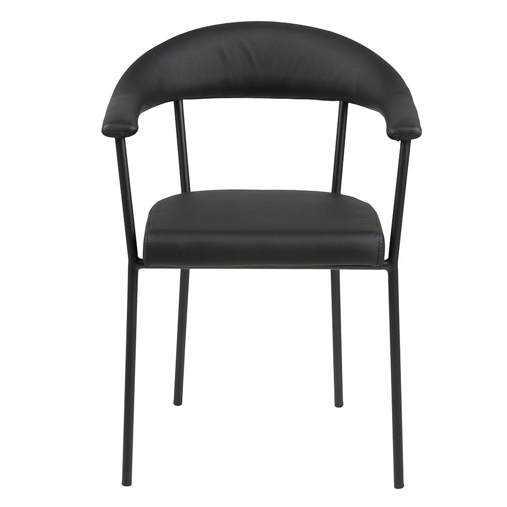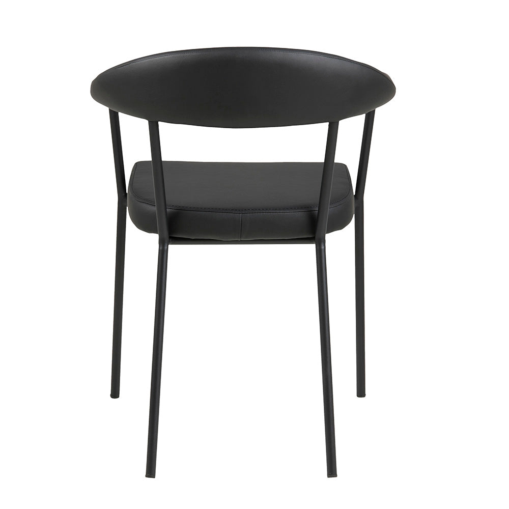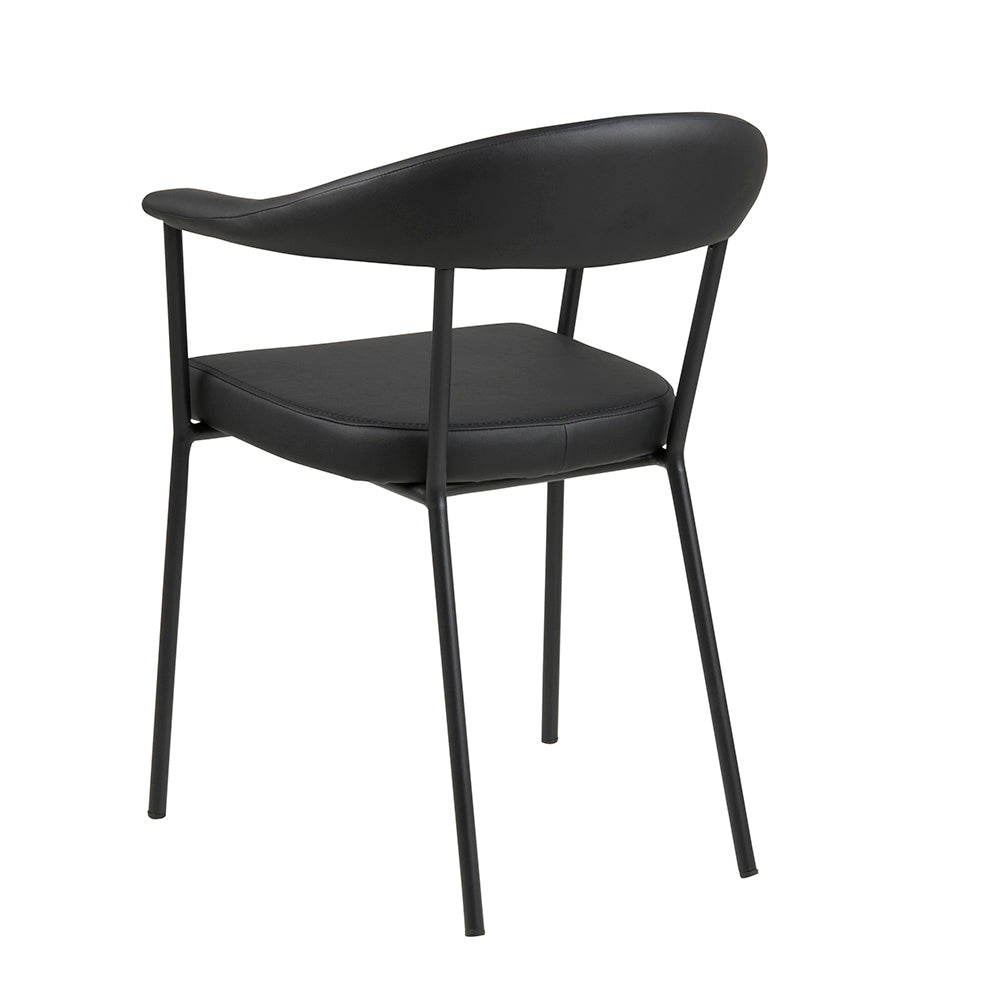 Featuring contemporary elegance, the LAVA dining chair adds a lightweight touch to your dining room. Inspired by minimalism, its sophisticated seat with armrests is upholstered in black faux leather fabric, resting in a slim black metal frame like a jewel. The slightly curved backrest ensures a comfortable experience.