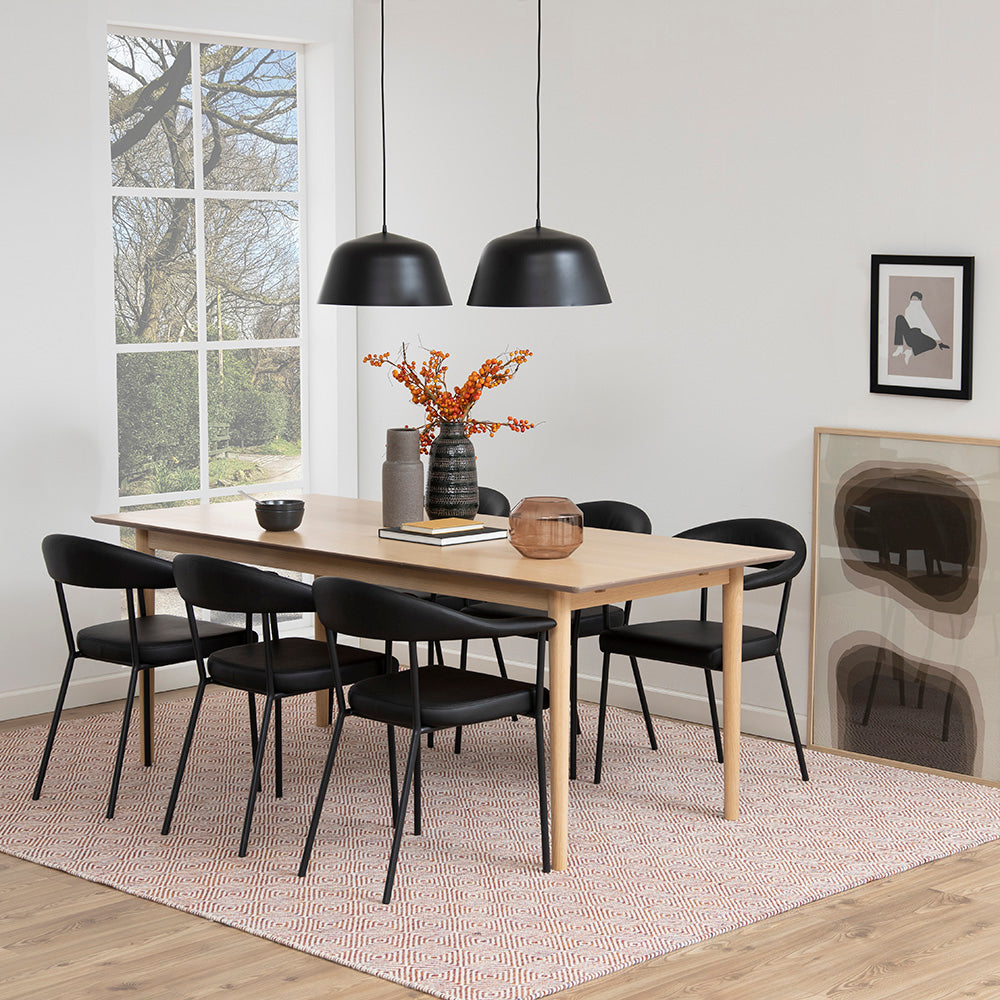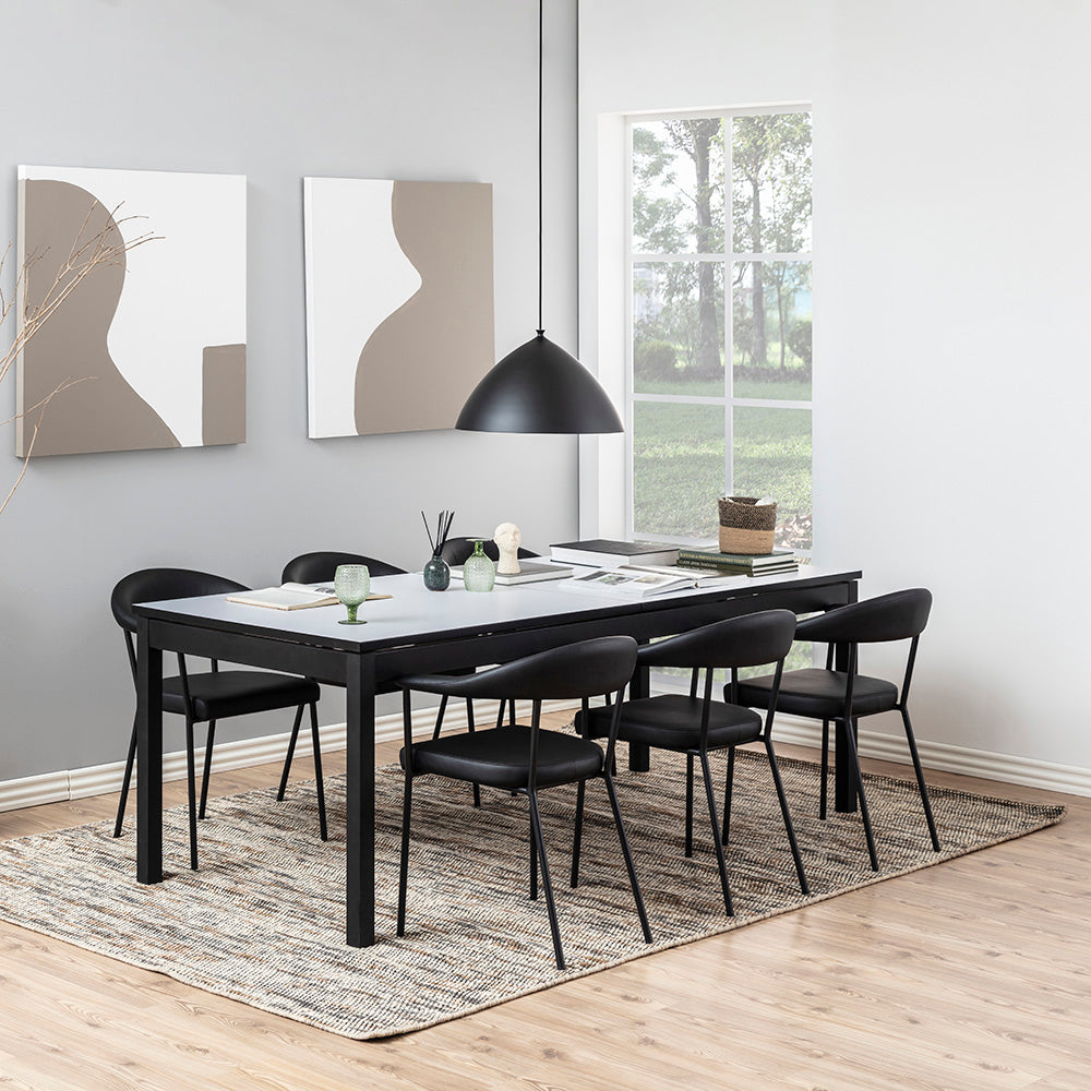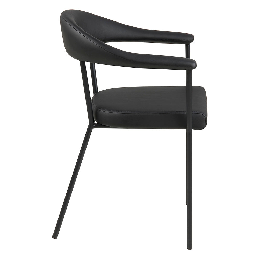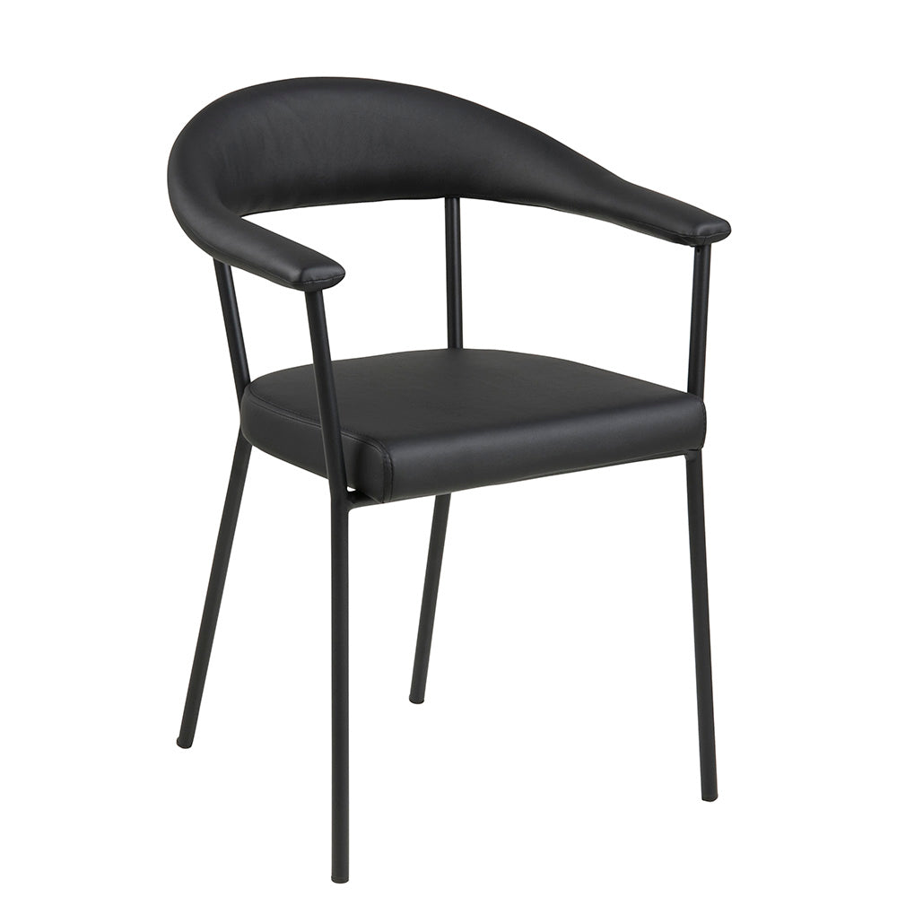 Featuring contemporary elegance, the LAVA dining chair adds a lightweight touch to your dining room. Inspired by minimalism, its sophisticated seat with armrests is upholstered in black faux leather fabric, resting in a slim black metal frame like a jewel. The slightly curved backrest ensures a comfortable experience.