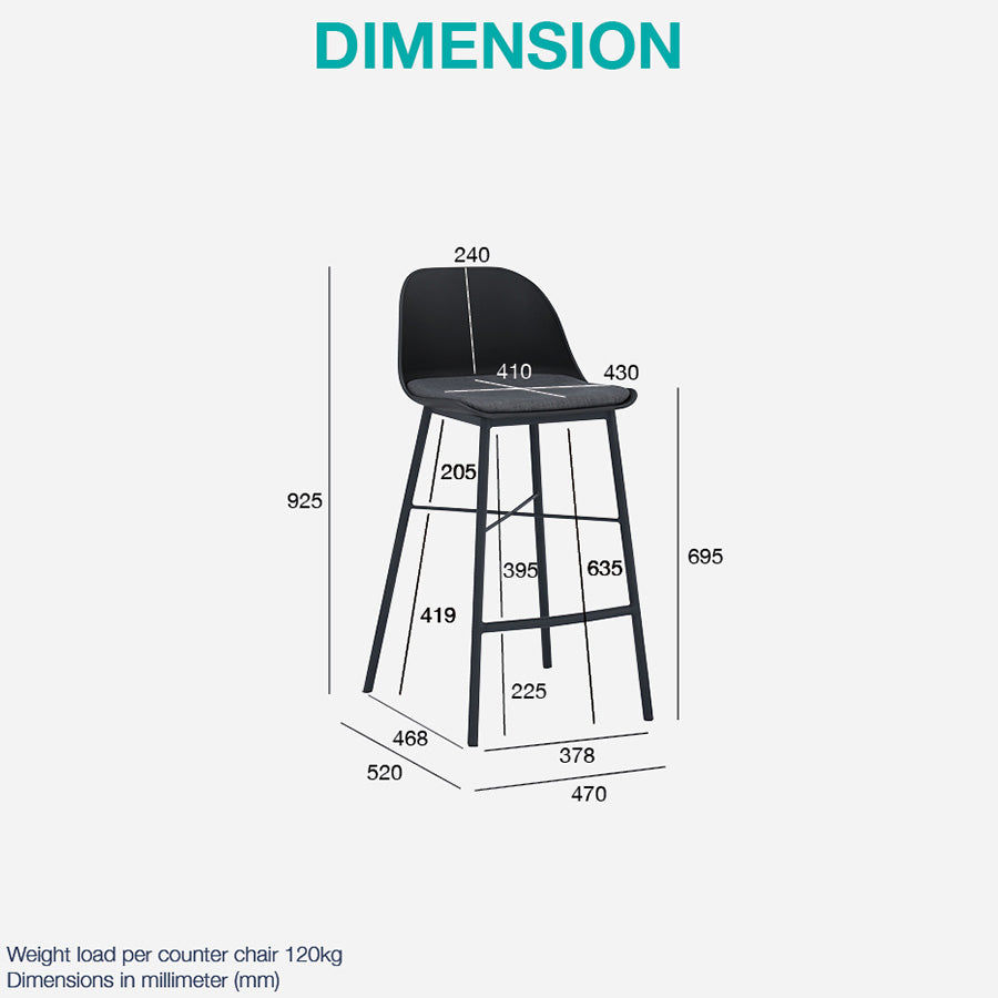 The LAXMI Counter Stool is made of polypropylene and virgin resin, with a Black Grey seat and grey cushion for added comfort. The stool has elegant and comfortable design features, with legs finished in a matte black epoxy. It is a stylish and functional addition to any counter or bar area.