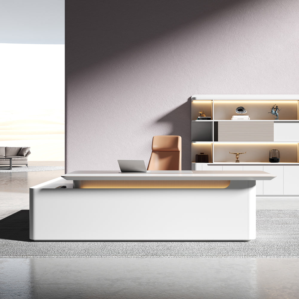 Utilize your workday to its fullest potential with the LUSH Executive Office Desk, featuring a wide desktop and ample storage space to organize your daily workload. This highly functional, elegant and sleek desk, with its fresh and light colors, will add a chic look and sophisticated style, creating a professional ambiance.