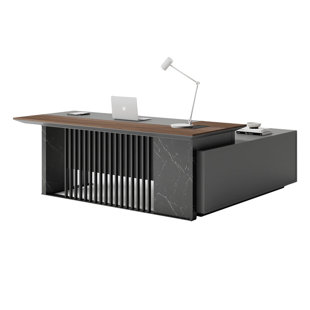 The 2.2M MADEIRA Executive Desk in Hazelnut and Grey colors is a striking piece of furniture that combines functionality and style. The desk features stainless steel bars and a marble-look front panel, adding a touch of luxury and sophistication to your workspace. Its classic and versatile design makes it suitable for various office settings.