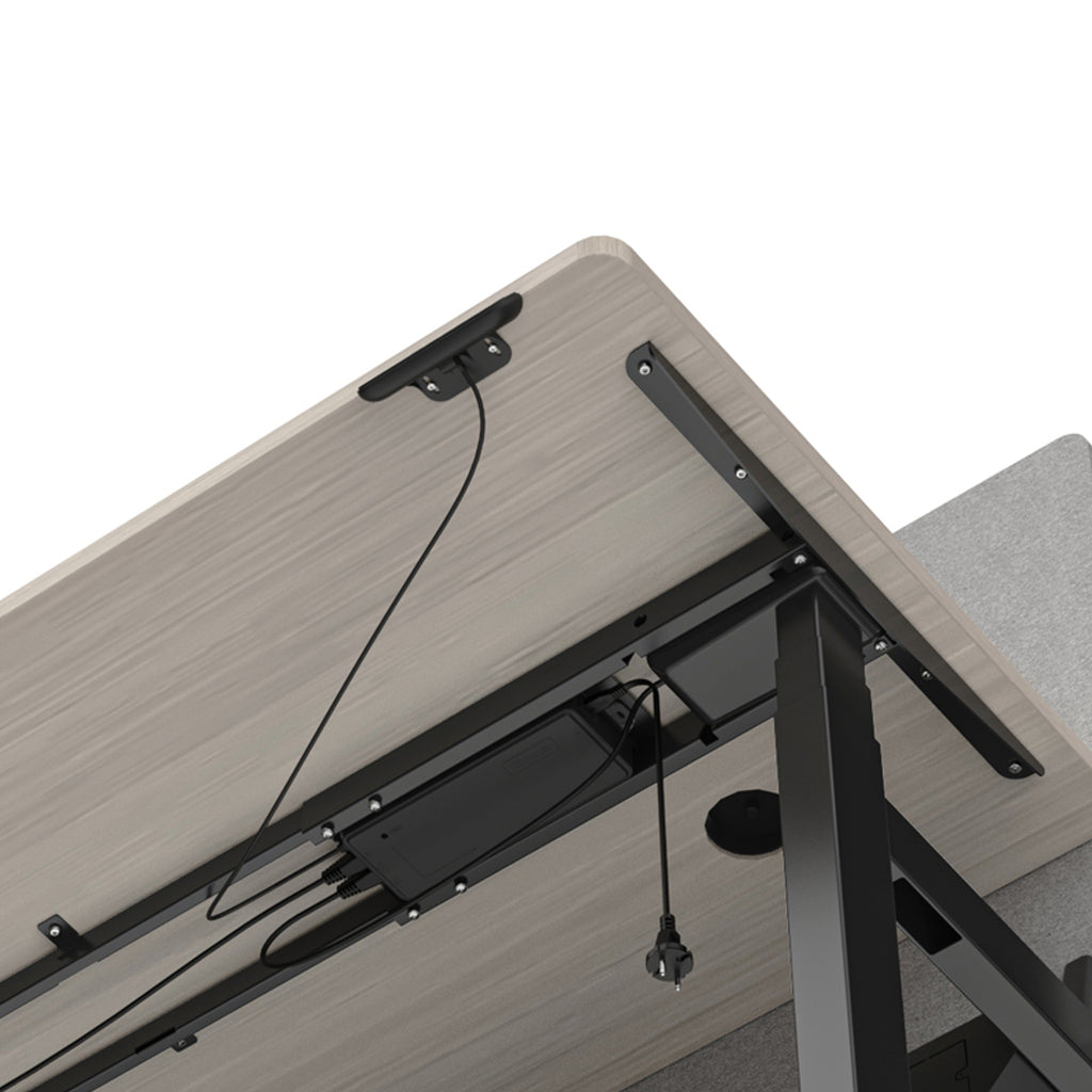 The body of the workstation is constructed with sturdy metal and equipped with dual electric lifts for easy height adjustment. The table top is made of E1 boards with a melamine finish in oak color, ensuring durability and style.