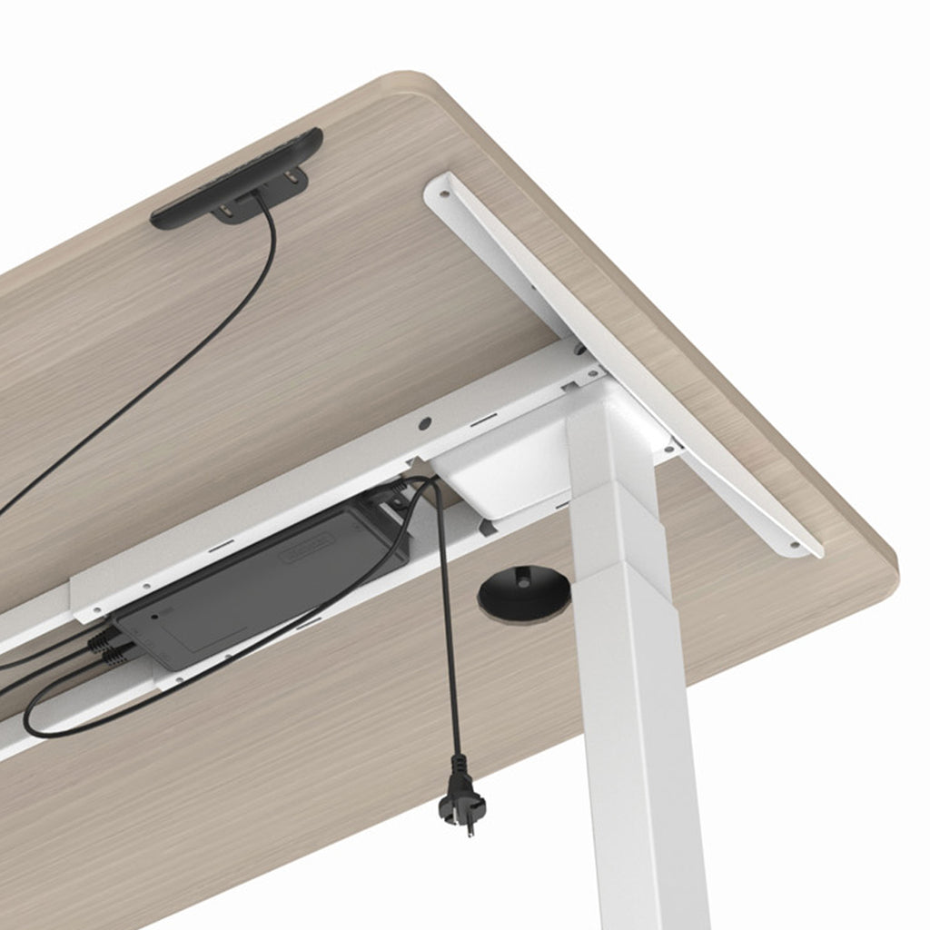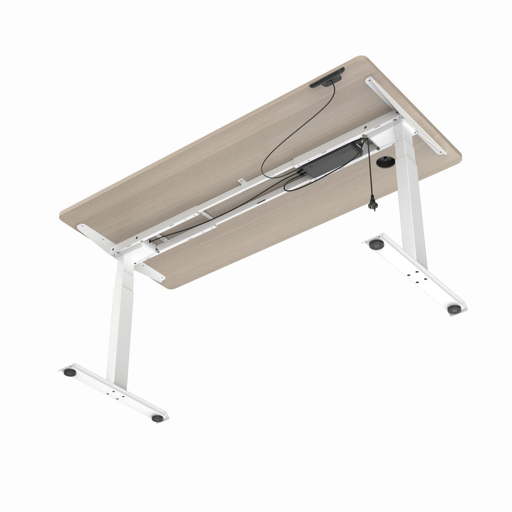 The body of the workstation is constructed with sturdy metal and equipped with an electric lift for easy height adjustment. The table top is made of E1 boards with a melamine finish in oak color, ensuring durability and style.