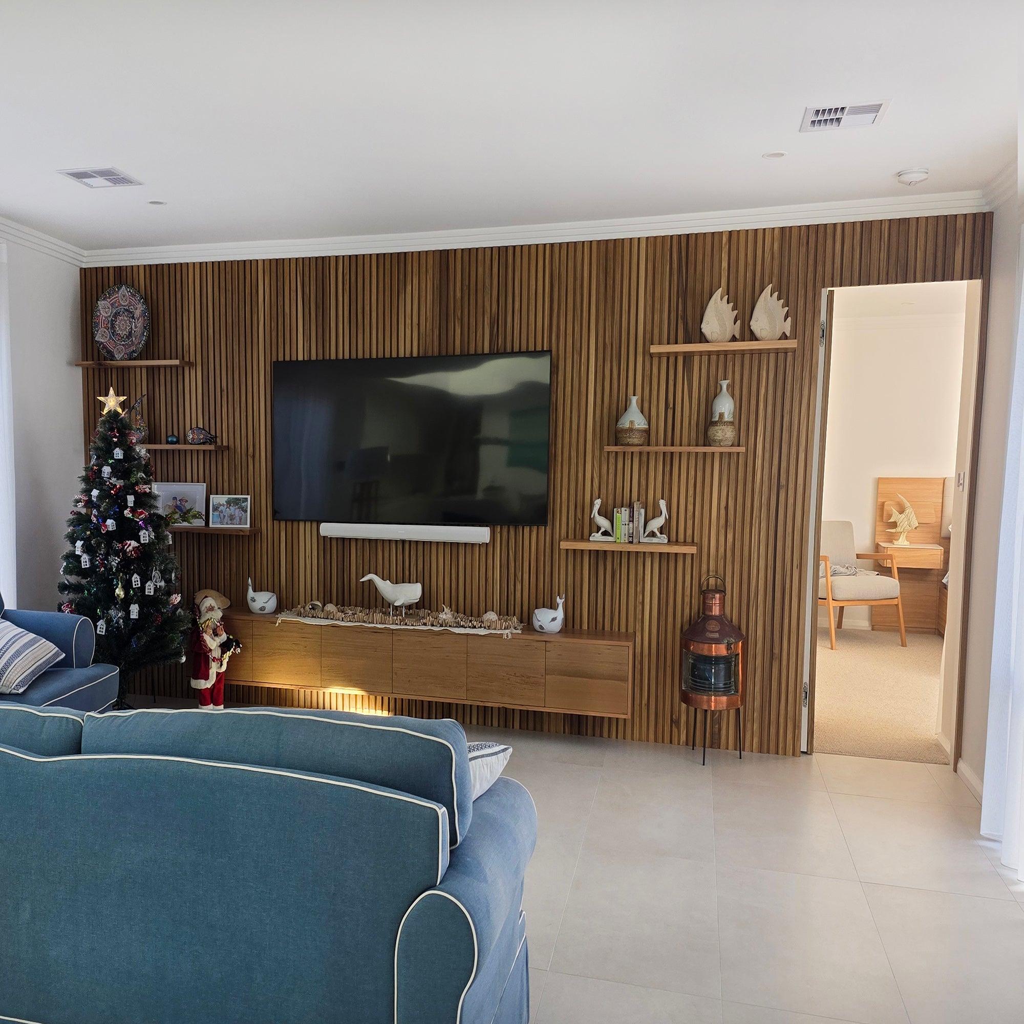 I’m so pleased with the timber paneling, it worked perfectly for our application. The majority was placed around our integrated fridge and housing our pantry. Also a feature panel on the end of the kitchen to separate it from what will be the entrance to our staircase.